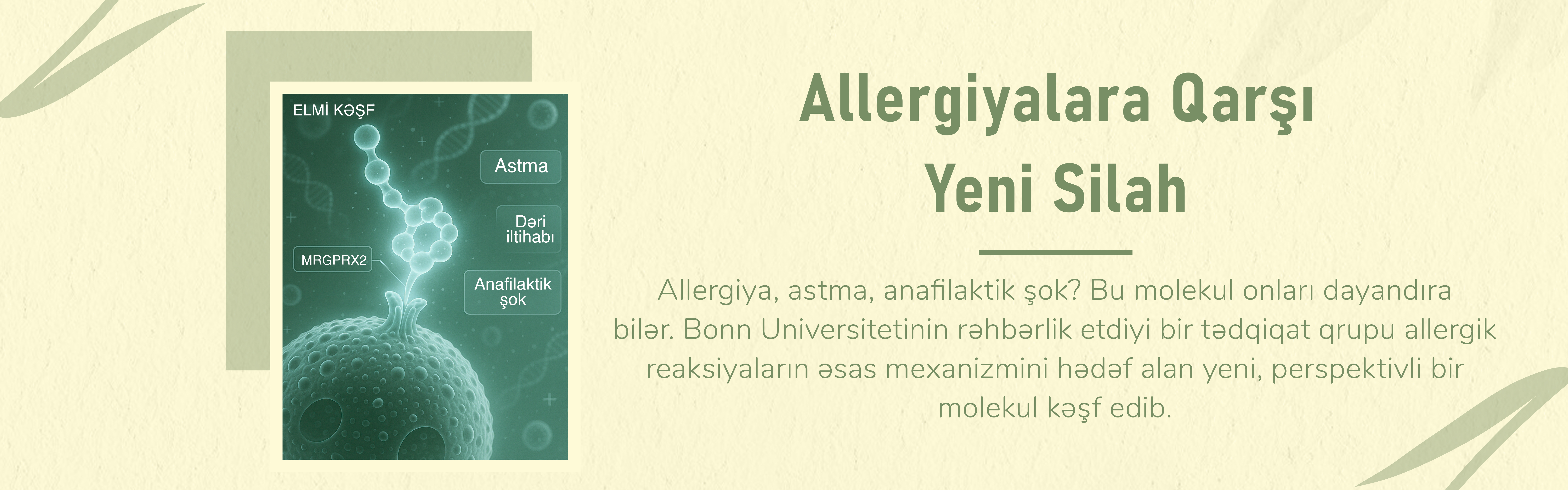 Allergiyalar, astma, miqren, xroniki qaşınma və qıcıqlanmış bağırsaq sindromu kimi xəstəliklər milyonlarla insanın həyat keyfiyyətini aşağı salır. Bəzən bu reaksiyalar yalnız narahatlıq deyil, hətta həyati təhlükə də yarada bilir. Xoşbəxtlikdən, Bonn Universitetinin rəhbərlik etdiyi bir tədqiqat qrupu allergik reaksiyaların əsas mexanizmini hədəf alan yeni, perspektivli bir molekul kəşf edib. Bu bioaktiv birləşmə immun sisteminin həddindən artıq reaksiyalarının qarşısını alaraq həm simptomları azaldır, həm də ölümcül fəsadların qarşısını ala bilər.Bu əlamətdar kəşf “Signal Transduction and Targeted Therapy” adlı nüfuzlu elmi jurnalda dərc olunub.