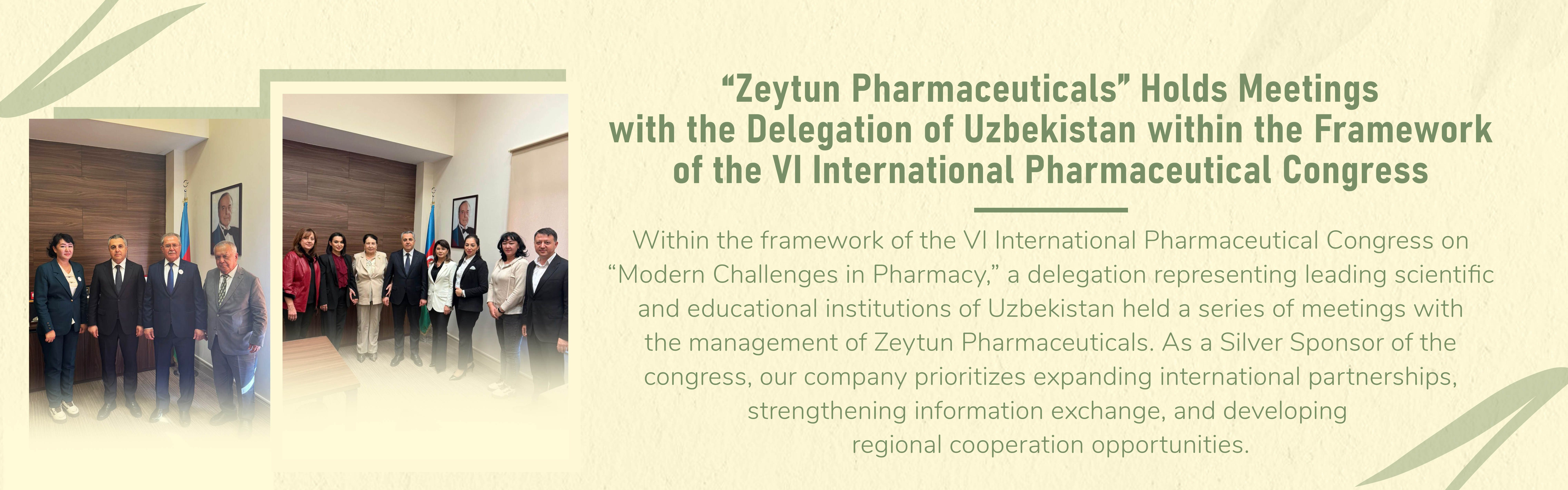 At the first meeting, the General Director of “Zeytun Pharmaceuticals,” Bahruz Shiraliyev, together with Professor Mahbuba Valiyeva, Head of the Department of Pharmaceutical Technology and Management at Azerbaijan Medical University, held discussions with Shamansur Shakhsaidovich Sagdullaev, First Vice-President of the Academy of Sciences of the Republic of Uzbekistan and Director of the Institute of Chemistry of Plant Substances named after S. Yunusov. Subsequently, Professor Karieva Ekut Saidkarimovna, Doctor of Pharmaceutical Sciences and Head of the Department of Pharmaceutical Technology at the Tashkent Pharmaceutical Institute; Doctor of Pharmaceutical Sciences Nuridullaeva Kamola Negmatilloevna, Chair of the Pharmacovigilance Committee of the “Center for the Safety of Pharmaceutical Products” of the Republic of Uzbekistan; as well as DSc Firuza Maksudova, Vice-Rector for Practical Training of the Tashkent Pharmaceutical Institute, held meetings with the company’s management.